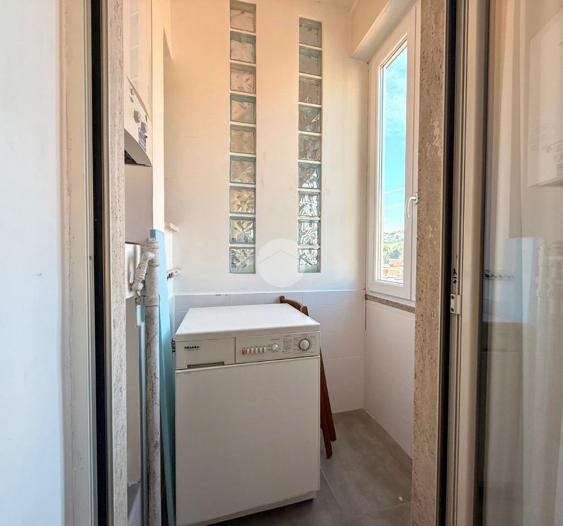 Accesso in open space illuminato da un'ampia finestra con esposizione libera, arredato con due divani letto, angolo cottura completo di elettrodomestici quali frigo e forno, bagno finestrato completo di igienici sospesi, box doccia e vano lavanderia annesso.