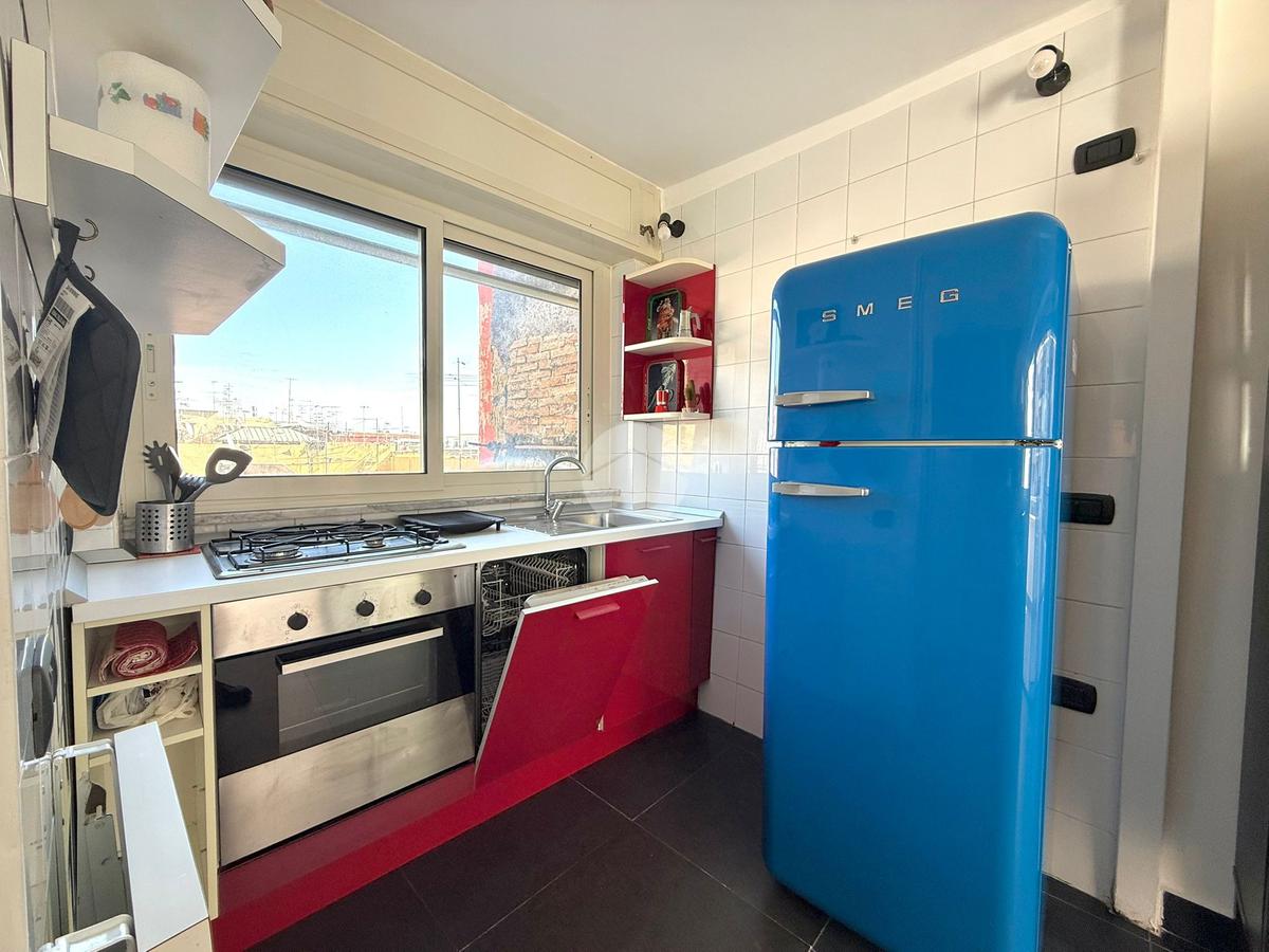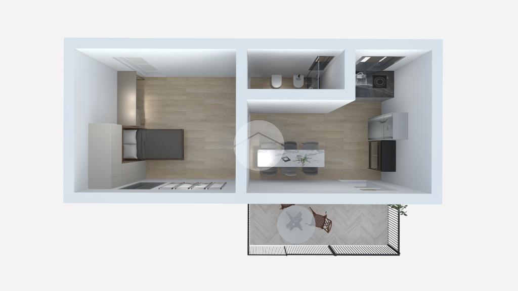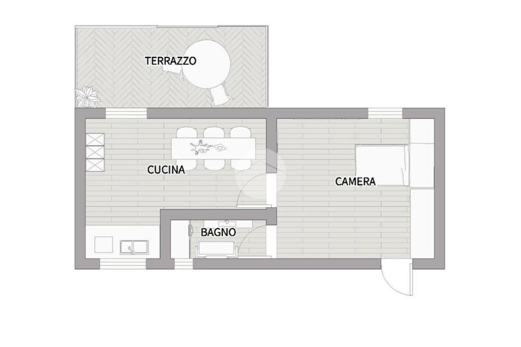 La soluzione e' cosi composta: Ingresso in soggiorno con divano letto, bagno finestrato con box doccia in vetro, vano lavanderia, cucina con accesso al terrazzo a livello attrezzato di tenda da sole, tavolino e sedie da esterno.